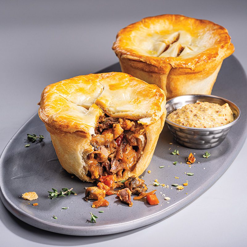Blätterteig, Rinderhackfleisch, Zwiebeln, Knoblauch, Tomatenmark, Worcester-Sauce, Schwarzer Pfeffer, Butter und Öl.